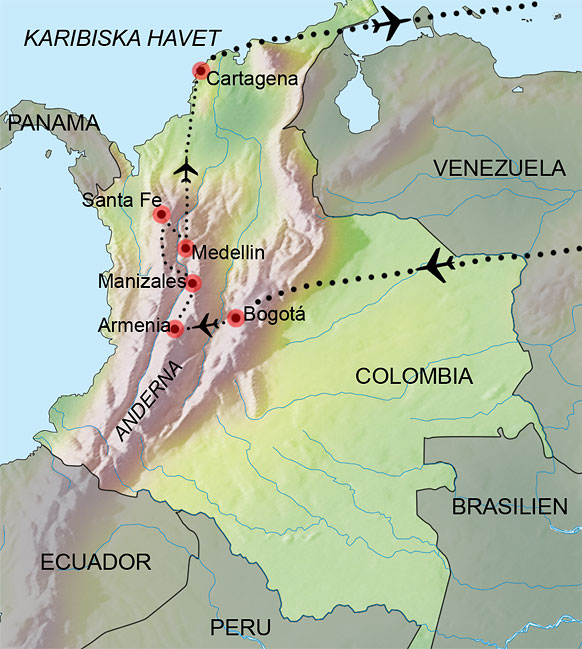Vi hänförs av kaffeplantagerna under vår resa genom kaffetriangeln, av Andernas skönhet och av Cartagenas varsamt renoverade koloniala stadsdelar. De karibiska rytmerna och den härliga lokalbefolkningen gör att vi går ner i varv och kan njuta i fulla drag av vår semester.