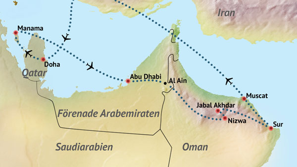 Följ med på en resa till fyra spännande och behagliga länder i det lugna hörnet av mellanöstern; Qatar, Bahrain, Förenade Arabemiraten och Oman.